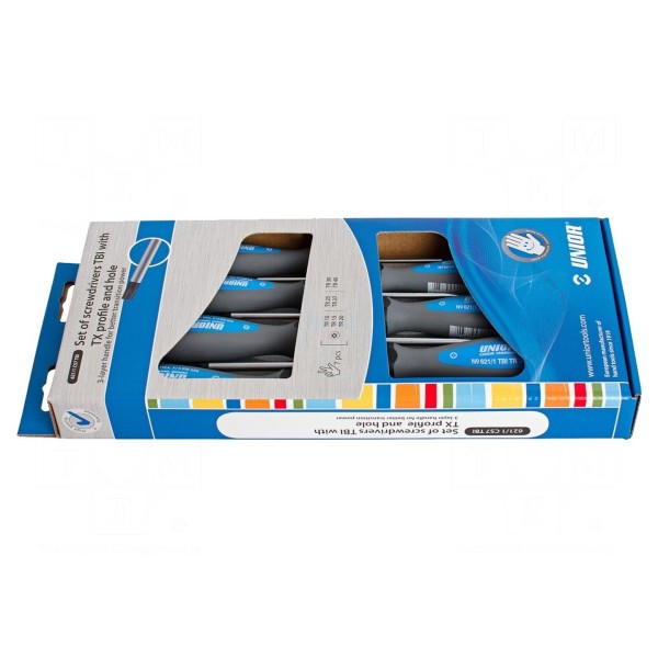 Zestaw zawiera siedem wkrętaków typu Torx z zabezpieczeniem w rozmiarach T10H, T15H, T20H, T25H, T27H, T30H oraz T40H. Ostrza narzędzi zostały wykonane ze stali chromowo-wanadowej, a ich końcówki poddano procesowi czernienia w celu zwiększenia odporności na korozję.