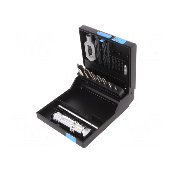 Komplet składa się z 16 elementów umieszczonych w plastikowym pudełku, które ułatwia przechowywanie i porządkowanie akcesoriów. W zestawie: gwintowniki, uchwyt do gwintowników, uchwyt grzechotkowy oraz wiertła. Zastosowanie uchwytu grzechotkowego poprawia ergonomię pracy w ograniczonych przestrzeniach roboczych.
