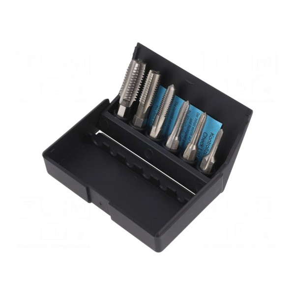 W skład zestawu wchodzi 6 sztuk gwintowników zamkniętych w plastikowym pudełku ułatwiającym przechowywanie i organizację. Konstrukcja materiałowa zapewnia stabilne właściwości skrawne podczas eksploatacji.