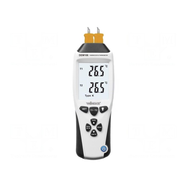 Cyfrowy miernik temperatury VELLEMAN DEM106 został wyposażony w wyświetlacz LCD prezentujący wyniki w formacie 4 cyfr. Urządzenie obsługuje pomiary z wykorzystaniem termopar typu K w zakresie od –200 do 1370°C oraz termopar typu J w przedziale od –200 do 1100°C. Dokładność pomiaru temperatury wynosi ±1°C przy precyzji odczytu na poziomie 0,5%.
