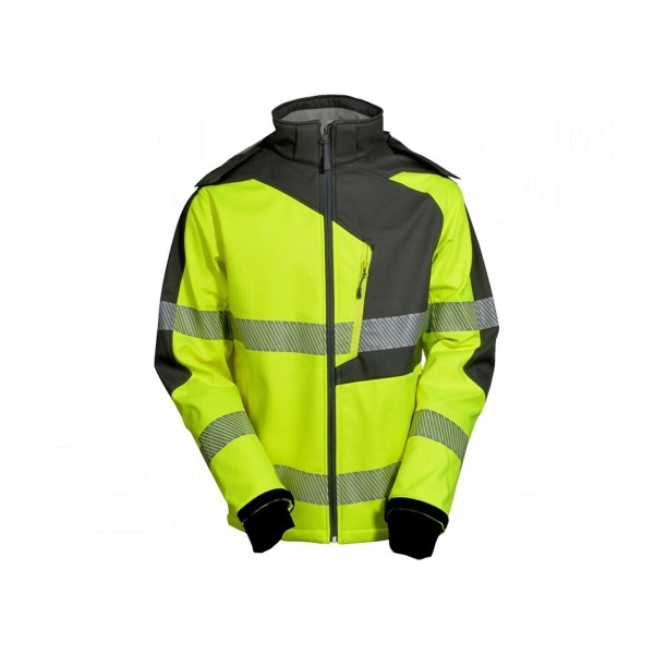 Produkt dostępny jest w rozmiarze M. Konstrukcja typu softshell stanowi element odzieży ochronnej, przeznaczony do użytku w środowiskach wymagających podwyższonego poziomu widoczności.