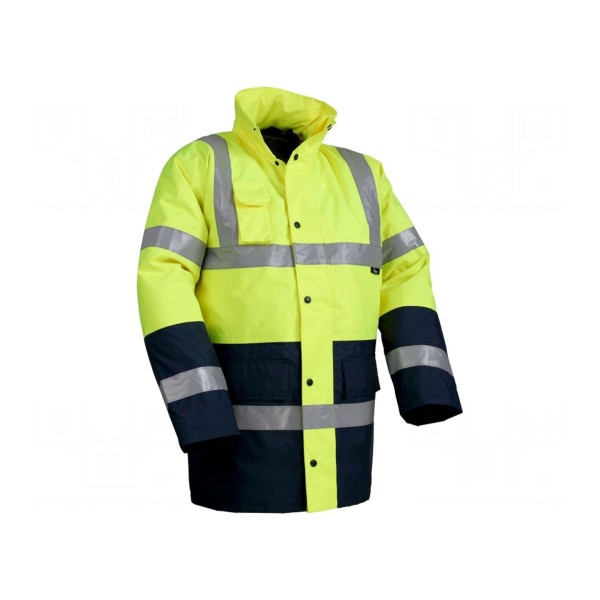 Produkt dostępny jest w kolorystyce żółto-granatowej w rozmiarze XXXL. Kurtka została zaprojektowana w wersji ostrzegawczej, spełniając wymagania dla odzieży typu BHP.