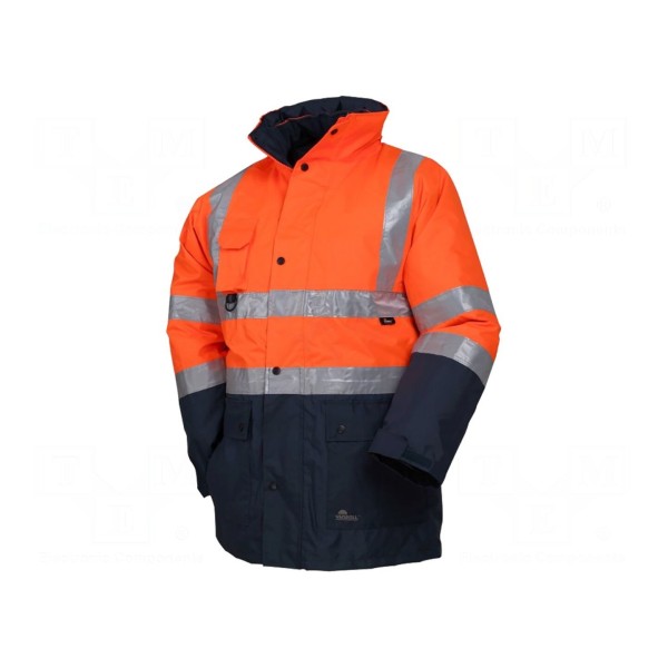 Kurtka robocza w wersji ostrzegawczej przeznaczona jest do użytku w warunkach wymagających zwiększonej widoczności pracownika. Model w rozmiarze M charakteryzuje się kolorystyką pomarańczowo-granatową.