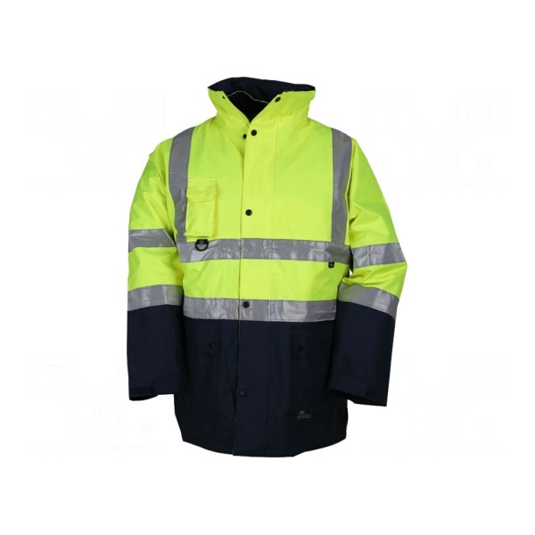 Kurtka robocza w rozmiarze XXXXXL charakteryzuje się kolorystyką żółto-granatową, zapewniającą intensywną widoczność użytkownika. Jest to odzież typu ostrzegawczego, zaprojektowana do użytkowania w różnych warunkach atmosferycznych jako model wielosezonowy.