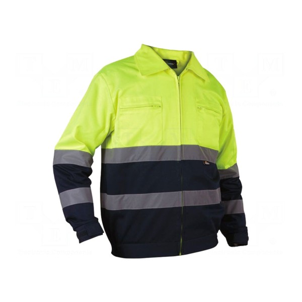 Kurtka robocza marki VIZWELL w rozmiarze S została zaprojektowana w wersji ostrzegawczej, co zapewnia użytkownikowi zwiększoną widoczność w warunkach roboczych. Produkt charakteryzuje się dwukolorową stylistyką, łączącą odcienie żółtego i granatowego.