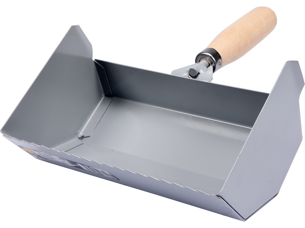 Lakierowana blacha stalowa, zębate krawędzie, drewniana rękojeść z zaczepem.