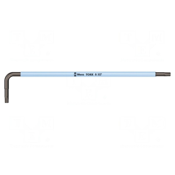Klucz Torx w rozmiarze TX8 o długości całkowitej 90 mm został wykonany ze stali. Konstrukcja typu długiego wyposażona jest w funkcję przytrzymywania, która wspomaga pracę z elementami złącznymi.