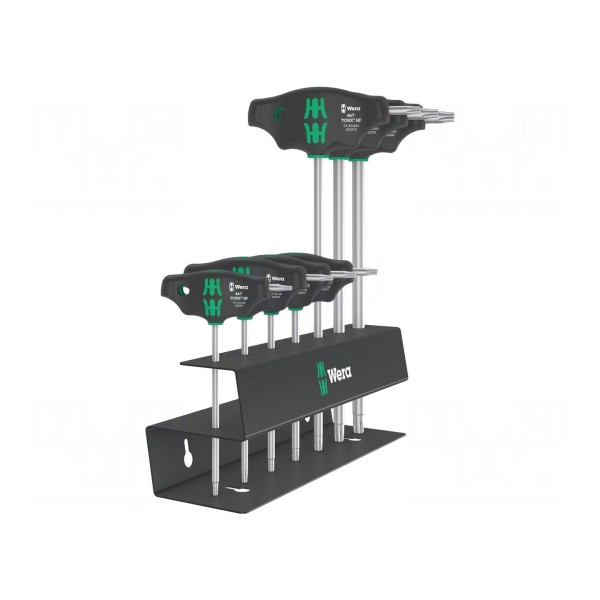Zestaw zawiera 7 wkrętaków typu Torx z rękojeścią w kształcie litery T. Narzędzia przeznaczone są do obsługi śrub w rozmiarach TX10, TX15, TX20, TX25, TX30, TX40 oraz TX45. Konstrukcja końcówek została wzbogacona o funkcję przytrzymywania, co ułatwia pracę w miejscach o utrudnionym dostępie.