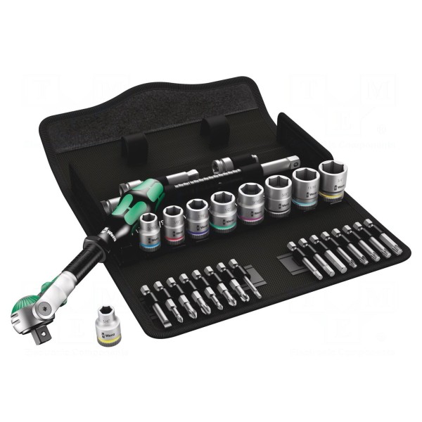 W zestawie: adapter, grzechotka 3/8" Zyklop Speed, końcówki wkrętakowe, nasadki 6-kątne 3/8", przedłużacz 3/8" o długości 76mm oraz przedłużacz 3/8" o długości 200mm.