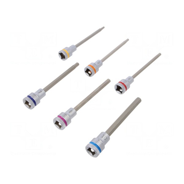 Zestaw obejmuje sześć kluczy nasadowych typu imbus z gniazdem 1/2". Narzędzia zostały wykonane ze stali chromowo-wanadowej. W skład kompletu wchodzą nasadki o rozmiarach HEX 4mm, 5mm, 6mm, 7mm, 8mm oraz 10mm.