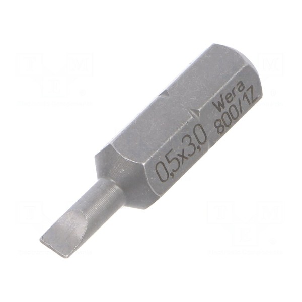 Końcówka wkrętakowa o profilu płaskim przeznaczona jest do pracy ze śrubami o rozmiarze 3x0,5mm. Element posiada uchwyt o średnicy D6,3mm, co odpowiada standardowi 1/4".