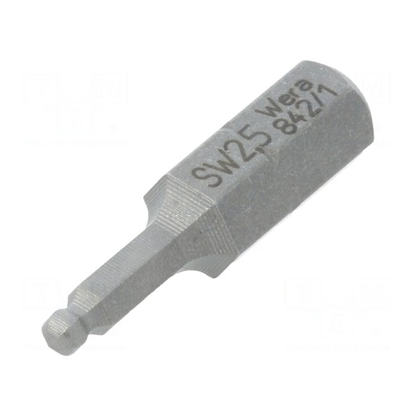 Końcówka wkrętakowa o profilu imbusowym z kulistym grotem przeznaczona jest do współpracy z wkrętami z gniazdem sześciokątnym. Rozmiar grota wynosi HEX 2,5mm, co pozwala na precyzyjną pracę w warunkach wymagających użycia kluczy imbusowych.