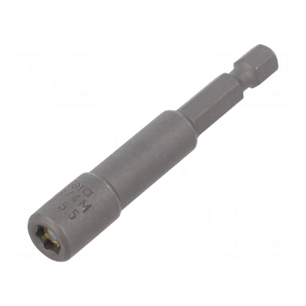 Końcówka wkrętakowa typu nasadka 6-kątna wyposażona w gniazdo HEX 5,5 mm. Element posiada magnetyczną konstrukcję, co wpływa na stabilność osadzenia łączników podczas pracy.