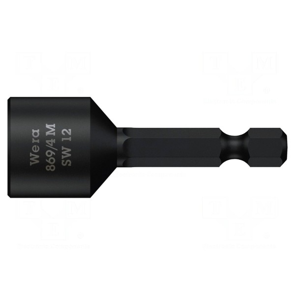 Końcówka wkrętakowa typu nasadka 6-kątna została wyposażona w gniazdo HEX 12mm. Element jest przeznaczony do współpracy z uchwytami o standardzie 1/4" (F6,3mm).