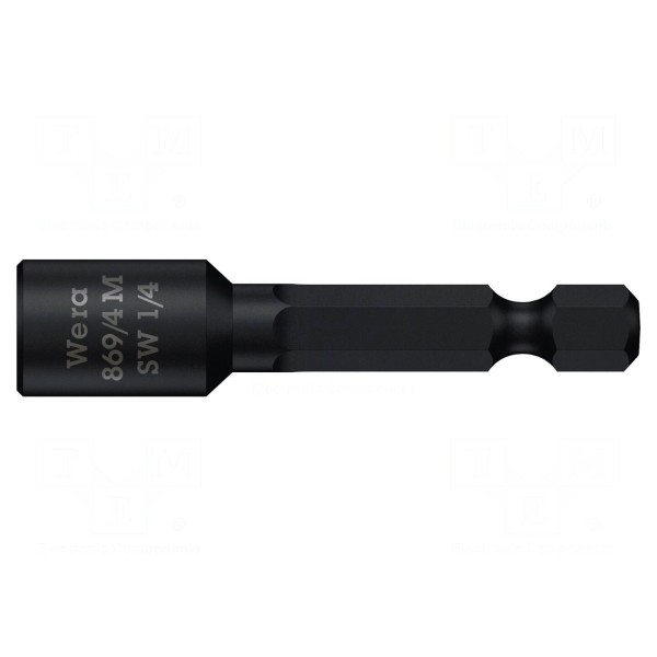 Końcówka wkrętakowa wyposażona w nasadkę 6-kątną o rozmiarze gniazda 1/4". Element posiada wersję magnetyczną, co ułatwia stabilne osadzenie wkrętów podczas pracy.