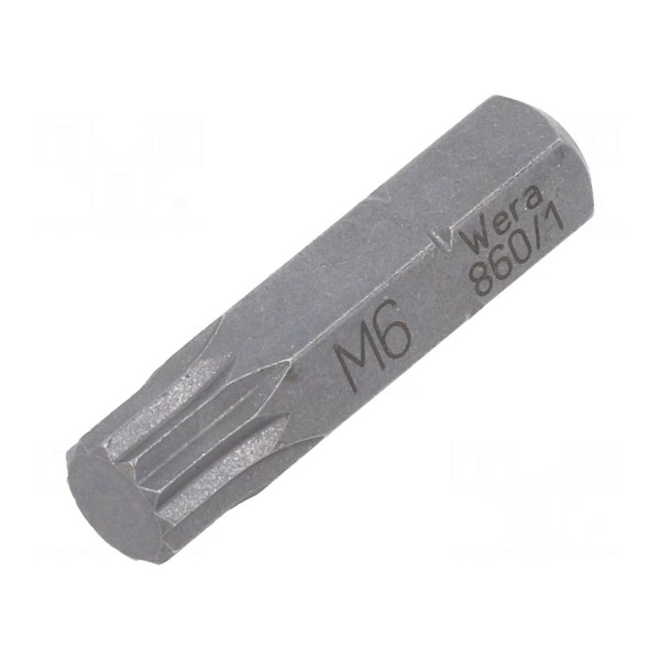 Końcówka wkrętakowa WERA o profilu spline (12-kątnym) została zaprojektowana do pracy ze śrubami typu XZN w rozmiarze M6. Element charakteryzuje się gniazdem uchwytu o wymiarze 1/4" oraz standardem mocowania D6,3mm.