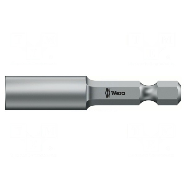 Końcówka wkrętakowa o długości całkowitej 50 mm przystosowana do pracy z prętami gwintowanymi. Element posiada gniazdo w rozmiarze M8 i charakteryzuje się gwintowaną wewnętrznie konstrukcją grota.