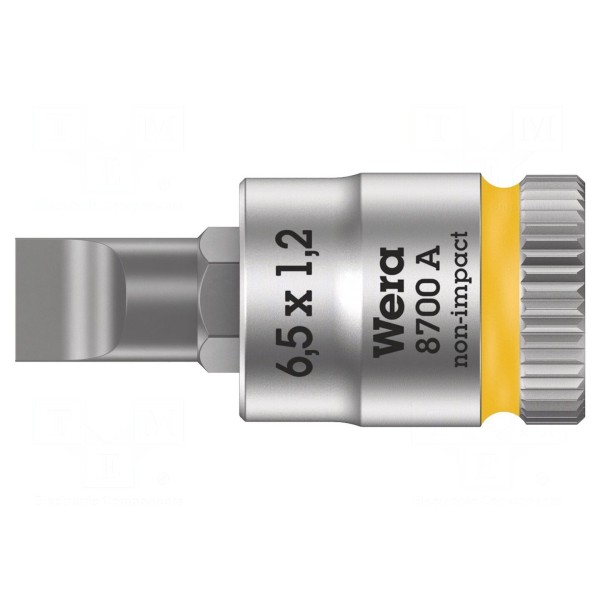 Nasadka z grotem płaskim o wymiarach 6,5x1,2 mm przeznaczona jest do współpracy z uchwytami o gnieździe 1/4". Element charakteryzuje się konstrukcją nasadową, typową dla prac montażowych wymagających precyzyjnego przeniesienia momentu obrotowego na śruby z nacięciem płaskim.