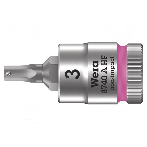 Nasadka typu imbus Hex-Plus przeznaczona jest do pracy z gniazdami HEX o rozmiarze 3 mm. Element wyposażono w mocowanie o standardzie 1/4", a jego całkowita długość wynosi 28 mm.