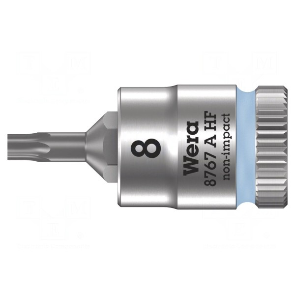 Nasadka typu nasadowego przeznaczona do obsługi śrub z gniazdem Torx w rozmiarze TX08. Element wyposażony jest w uchwyt o rozmiarze 1/4" oraz posiada zintegrowaną funkcję przytrzymywania, która wspomaga pracę w trudno dostępnych miejscach.