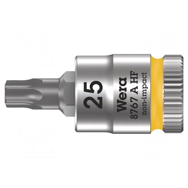 Nasadka o profilu Torx TX25 przeznaczona jest do pracy z uchwytami 1/4". Element o długości całkowitej 28 mm został wykonany ze stali chromowo-wanadowej i wykończony powłoką chromową.