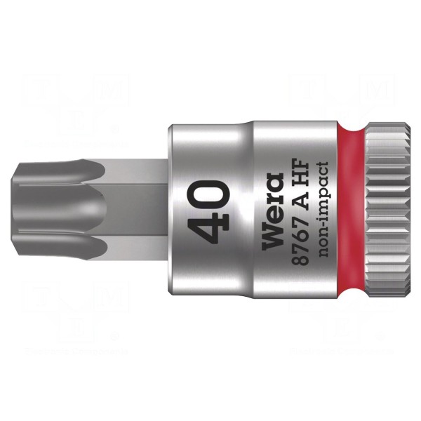 Nasadka klucza nasadowego typu Torx w rozmiarze TX40 przeznaczona jest do pracy z uchwytami o rozmiarze 1/4". Element charakteryzuje się długością 28 mm oraz został wyposażony w funkcję przytrzymywania śrub.