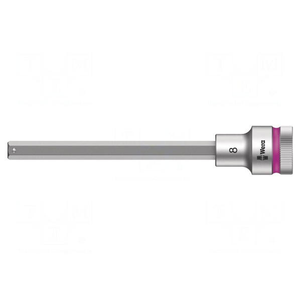 Nasadka nasadowa Wera typu imbus Hex-Plus przeznaczona jest do pracy ze śrubami z gniazdem sześciokątnym o rozmiarze 8 mm. Narzędzie zostało wykonane ze stali chromowo-wanadowej i wykończone warstwą chromu, co wpływa na jego trwałość. Konstrukcja zapewnia obsługę z mocowaniem 1/2".