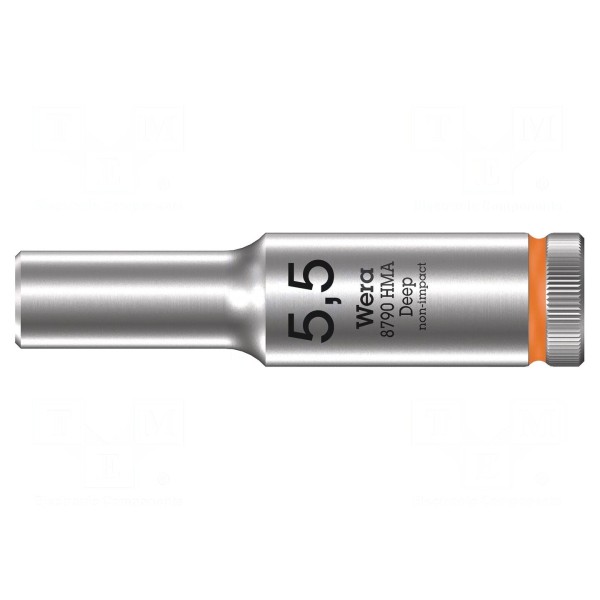 Nasadka sześciokątna typu 8790 HMA Deep o rozmiarze 5,5 mm przeznaczona jest do pracy z uchwytami o napędzie 1/4 cala. Element o długości całkowitej 50 mm wykonano ze stali chromowo-wanadowej, co zapewnia parametry wytrzymałościowe adekwatne do codziennych prac montażowych.