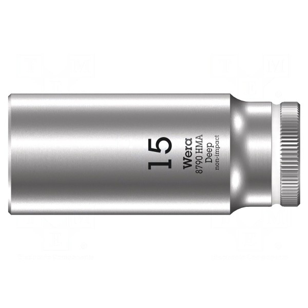 Nasadka nasadowa 6-kątna o rozmiarze gniazda HEX 15 mm przeznaczona jest do współpracy z uchwytami o rozmiarze 1/4". Element charakteryzuje się długością całkowitą wynoszącą 50 mm. Produkt został wykonany ze stali chromowo-wanadowej. Konstrukcja narzędzia uwzględnia kod kolorystyczny, który ułatwia rozpoznanie rozmiaru klucza.