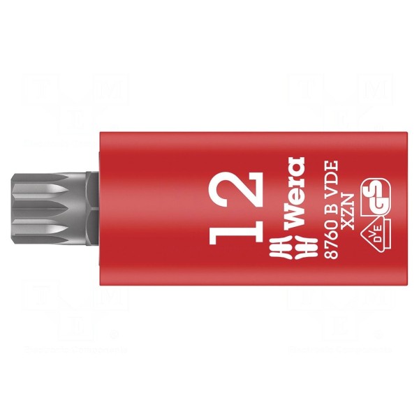 Nasadka o profilu wielokątnym typu spline (XZN) w rozmiarze M12 przeznaczona jest do współpracy z pokrętłami wyposażonymi w zabierak 3/8". Narzędzie charakteryzuje się całkowitą długością wynoszącą 59 mm. Konstrukcja elementu przystosowana jest do bezpiecznej pracy pod napięciem do 1 kV.