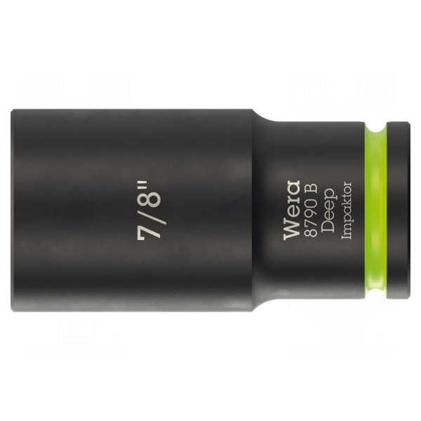 Nasadka udarowa o konstrukcji 6-kątnej przeznaczona jest do współpracy z narzędziami o zabieraku 3/8". Element charakteryzuje się rozmiarem gniazda 7/8" i długą budową, co pozwala na dostęp do głębiej osadzonych elementów złącznych.