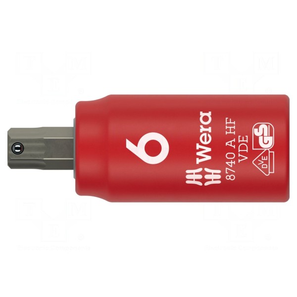 Nasadka typu 6-kątnego o rozmiarze HEX 6mm przeznaczona jest do współpracy z uchwytami o rozmiarze 1/4". Narzędzie charakteryzuje się izolowaną konstrukcją, co pozwala na bezpieczną pracę przy napięciach do 1kV AC. Produkt jest zgodny z normami IEC 60900 oraz VDE.