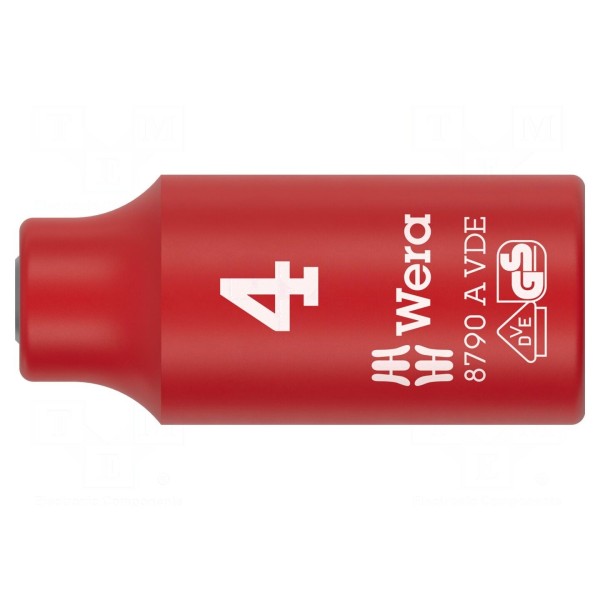 Nasadka 8790 A VDE Zyklop to izolowane narzędzie przeznaczone do pracy pod napięciem do 1kV AC. Element posiada gniazdo 6-kątne o rozmiarze 4mm oraz mocowanie 1/4". Konstrukcja zapewnia izolację zgodną z normami IEC 60900 oraz VDE.