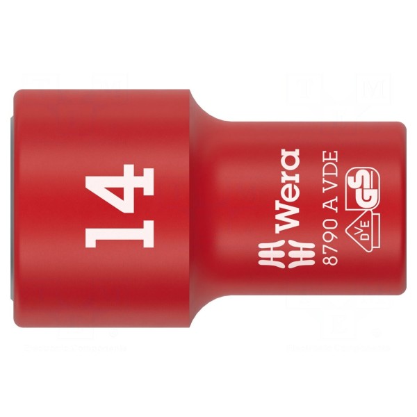 Nasadka 6-kątna 8790 A VDE Zyklop to izolowane narzędzie przeznaczone do pracy pod napięciem do 1kV AC. Element posiada gniazdo w rozmiarze HEX 14mm oraz mocowanie na uchwyt 1/4".