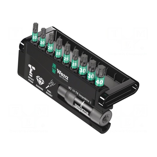 Powierzchnia końcówek została pokryta diamentową powłoką, która zwiększa przyczepność narzędzia do gniazda śruby. Całość kompletu dostarczana jest w plastikowym pudełku, zapewniającym organizację i przechowywanie elementów. W zestawie: adapter, końcówki wkrętakowe.