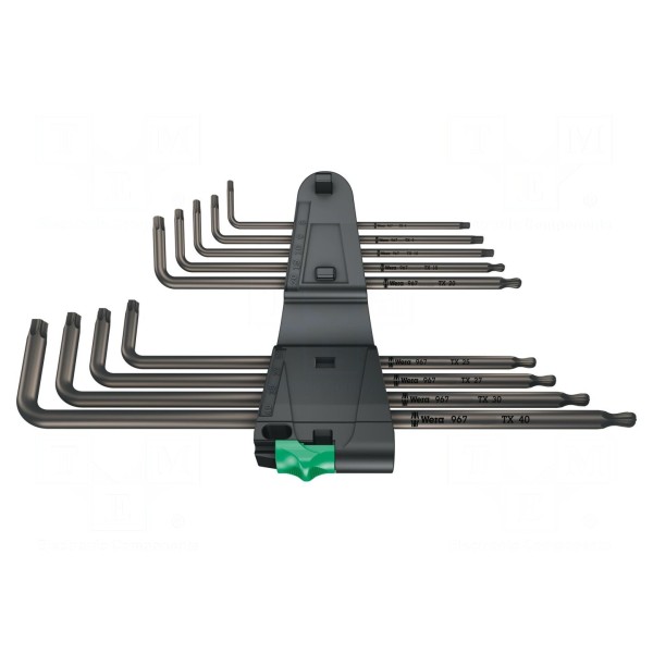 Zestaw kluczy typu Torx obejmuje dziewięć rozmiarów: TX8, TX9, TX10, TX15, TX20, TX25, TX27, TX30 oraz TX40. Narzędzia charakteryzują się czernioną powierzchnią, co zabezpiecza je przed korozją. Wykorzystane w konstrukcji dłuższych ramion kuliste zakończenie pozwala na pracę pod kątem, co ułatwia dostęp do śrub w miejscach o ograniczonej przestrzeni.