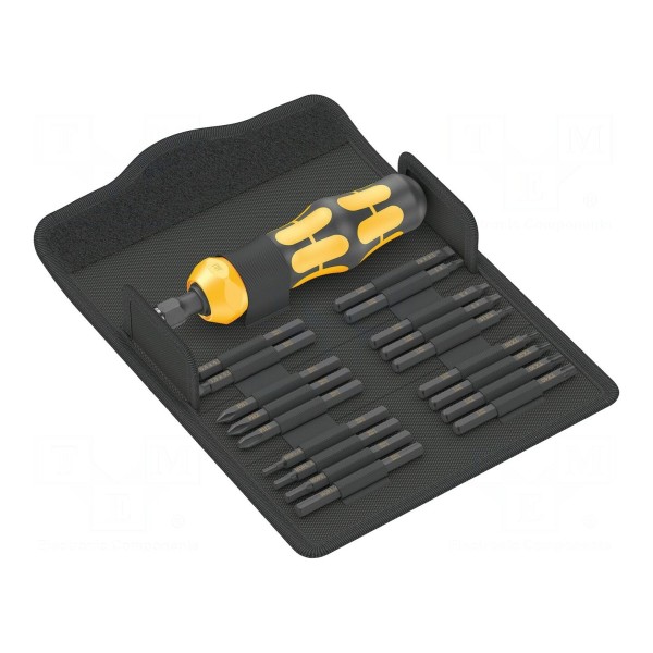 W zestawie: końcówki wkrętakowe, rękojeść wkrętakowa. Całość dostarczana jest w etui, które ułatwia przechowywanie i transport narzędzi. Dostępne rodzaje grotów obejmują profile imbus, kwadrat, Phillips, płaski oraz Torx.