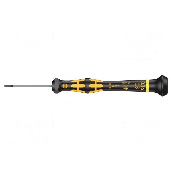 Wkrętak precyzyjny wyposażony w grot płaski o rozmiarze 0,8x0,16mm. Narzędzie zostało zaprojektowane w wersji ESD, co pozwala na bezpieczną pracę z komponentami wrażliwymi na wyładowania elektrostatyczne.