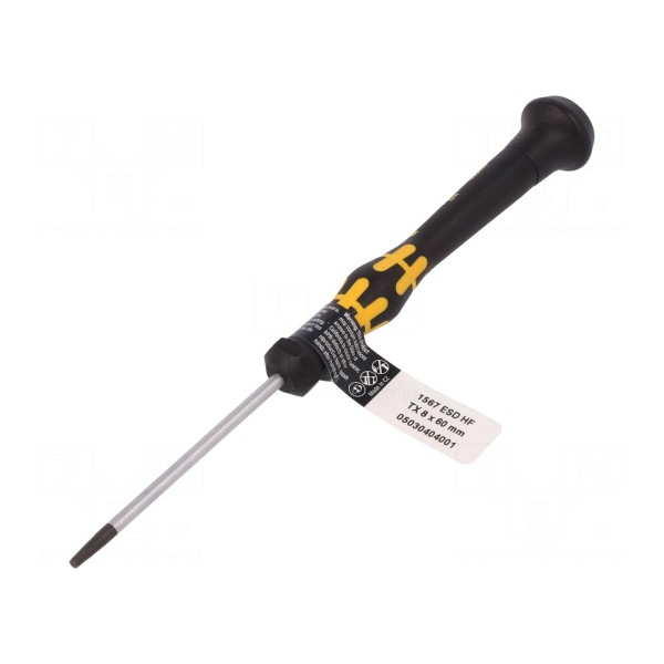 Wkrętak precyzyjny Wera 1567/TX8 przeznaczony jest do prac z wkrętami typu Torx w rozmiarze TX08. Narzędzie wyposażone jest w ostrze o długości 60 mm, a jego całkowita długość wynosi 157 mm. Konstrukcja narzędzia w wersji ESD zapewnia ochronę przed wyładowaniami elektrostatycznymi, co umożliwia stosowanie go przy pracach z komponentami elektronicznymi.