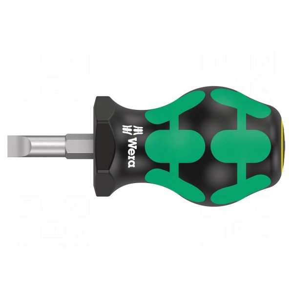 Wkrętak standardowy typu Stubby wyposażony w płaski grot o wymiarach 6,5x1,2mm. Konstrukcja z krótkim ostrzem o długości 24,5mm umożliwia pracę w miejscach o ograniczonej przestrzeni, gdzie standardowe narzędzia o większych gabarytach są niepraktyczne.
