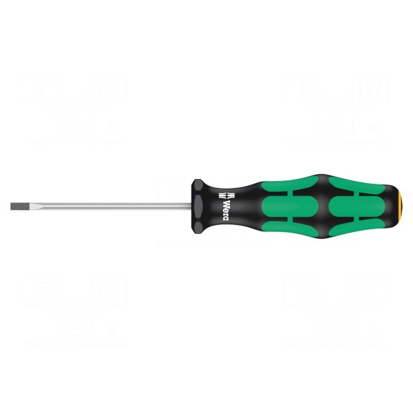 Wkrętak standardowy wyposażony jest w płaski grot o wymiarach 2,5x0,4mm. Długość robocza ostrza wynosi 60mm. Całkowita długość narzędzia to 130mm. Konstrukcja przystosowana jest do pracy ze śrubami o gnieździe płaskim.
