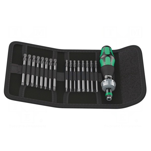 Zestaw zawiera rękojeść wkrętakową wyposażoną w mechanizm grzechotkowy oraz zestaw wymiennych końcówek wkrętakowych. Komplet obejmuje 17 elementów przechowywanych w etui, co ułatwia organizację narzędzi. Zróżnicowane typy grotów pozwalają na współpracę z wkrętami typu imbus, kwadrat, Phillips, płaskimi oraz Torx z zabezpieczeniem.