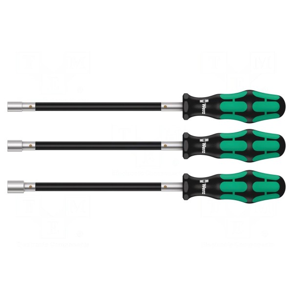 Zestaw zawiera trzy wkrętaki uniwersalne wyposażone w elastyczny trzon, co umożliwia pracę w miejscach o utrudnionym dostępie. Narzędzia przeznaczone są do obsługi śrub i nakrętek z łbem sześciokątnym.