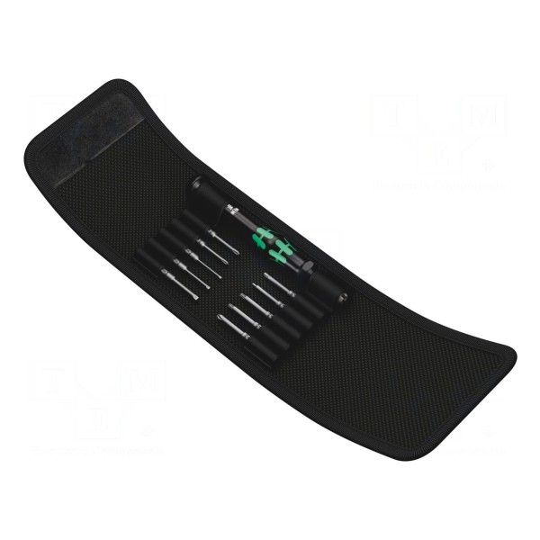 W zestawie znajdują się groty o rozmiarach: PH0, PH00, PH1, HEX 1,5mm, HEX 2mm, płaskie 1,5x0,23mm, 2x0,4mm, 3x0,5mm oraz Torx TX05 i TX06. Całość wyposażenia dostarczana jest w etui, które ułatwia organizację i przechowywanie akcesoriów. W zestawie: etui, końcówki wkrętakowe, rękojeść wkrętakowa.