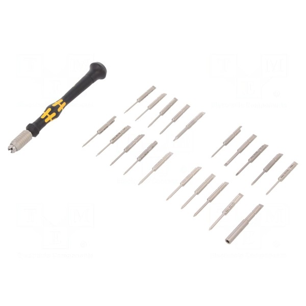 Zestaw składa się z 21 elementów, w tym uchwytu do końcówek wkrętakowych oraz wymiennych końcówek. Zastosowana rękojeść Kraftform Micro charakteryzuje się dwukomponentową budową i ergonomicznym kształtem, co pozwala na precyzyjną pracę. Końcówka rękojeści jest obrotowa, co ułatwia szybkie wkręcanie i wykręcanie, a zabezpieczenie przed staczaniem się zapobiega przypadkowemu przesuwaniu się narzędzia po powierzchni roboczej.