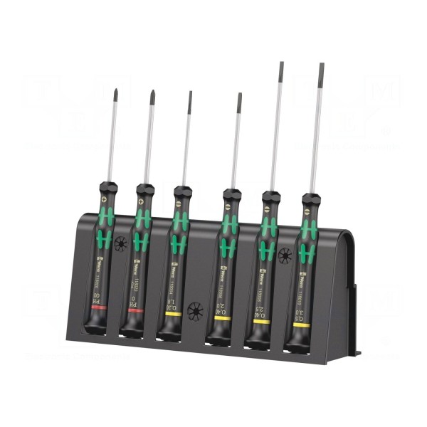 Zestaw zawiera sześć wkrętaków przeznaczonych do prac precyzyjnych, obejmujący groty typu Phillips oraz płaskie. W skład kompletu wchodzą rozmiary PH00 i PH0 o długości ostrza 60 mm, a także wkrętaki płaskie o wymiarach 0,3x1,8 mm, 0,4x2 mm, 0,4x2,5 mm oraz 0,5x3 mm. Zróżnicowane długości robocze ostrzy, wynoszące od 60 mm do 80 mm, pozwalają na dopasowanie narzędzia do konkretnych zadań montażowych.
