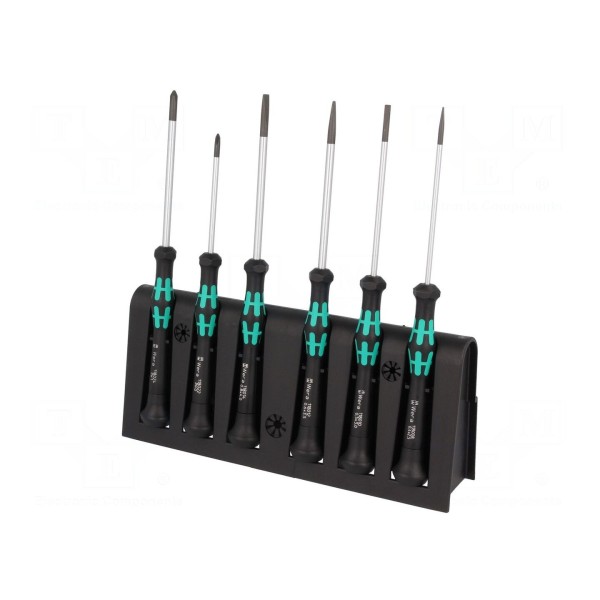 Zestaw zawiera sześć wkrętaków uniwersalnych przeznaczonych do prac precyzyjnych. W komplecie znajdują się narzędzia z grotami typu Phillips w rozmiarach PH0 i PH1 oraz groty płaskie o wymiarach 2,5x0,4mm, 3x0,5mm, 3,5x0,6mm i 4x0,8mm.