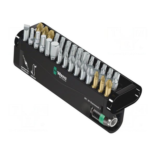 Zestaw zawiera 30 elementów przeznaczonych do prac montażowych. W komplecie znajdują się końcówki wkrętakowe o zróżnicowanych profilach, obejmujące rodzaje: imbus, Phillips, płaski, Pozidriv, Torx oraz Torx z zabezpieczeniem.