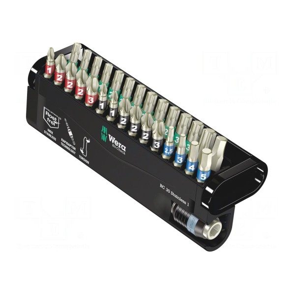 Zestaw zawiera 30 elementów, w tym adapter oraz szeroki wybór końcówek wkrętakowych o różnych rodzajach grotów, takich jak imbus, Phillips, Pozidriv oraz Torx. Komponenty przeznaczone są do pracy z uchwytami o gnieździe 1/4".