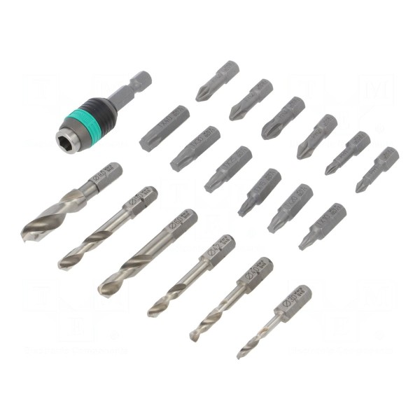 Zestaw zawiera końcówki wkrętakowe typu Phillips oraz Torx w rozmiarach PH1, PH2, PH3 oraz TX10, TX15, TX20, TX25, TX30, TX40. Narzędzia przeznaczone są do obróbki metalu i wykorzystują uchwyt o rozmiarze 1/4" (C6,3mm).